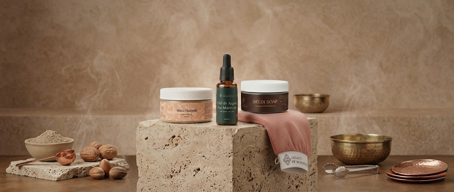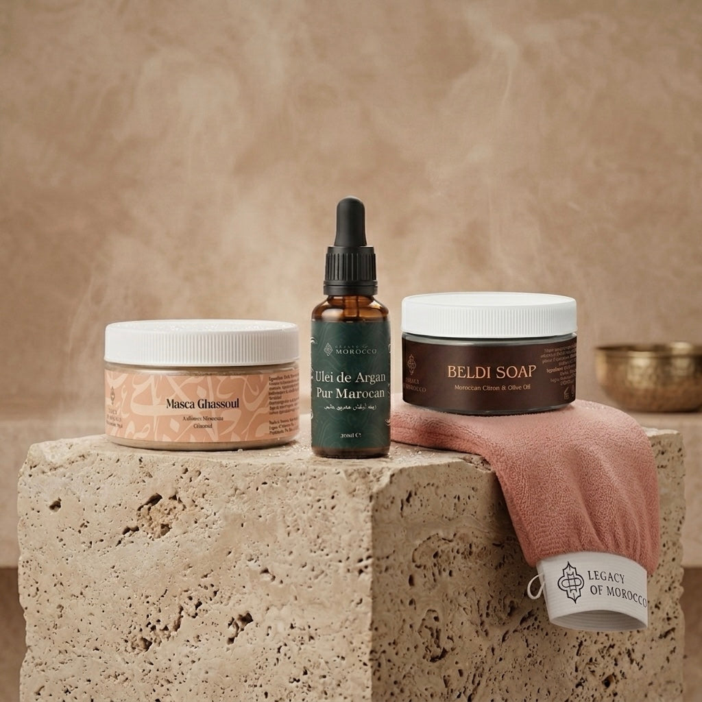 Un ritual complet în 4 pași, moștenit din tradiția hammamului marocan, care curăță în profunzime și lasă pielea vizibil mai netedă și luminoasă.